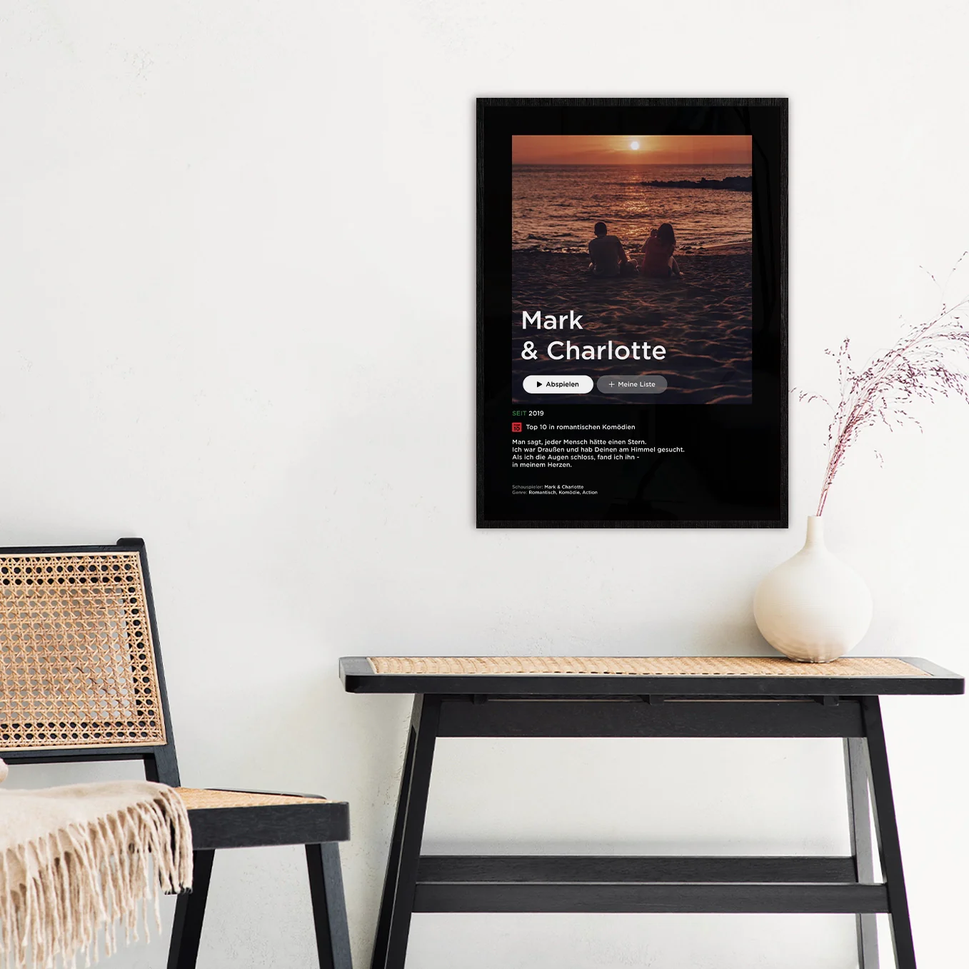 Gestalte jetzt Dein personalisiertes Liebesfilmposter. Ideal als personalisiertes Geschenk zum Jahrestag, Valentinstag oder auch zur Hochzeit. Personalisiere das Poster einfach mit Euren Namen, Eurem Jahr und einem Bild von Euch.