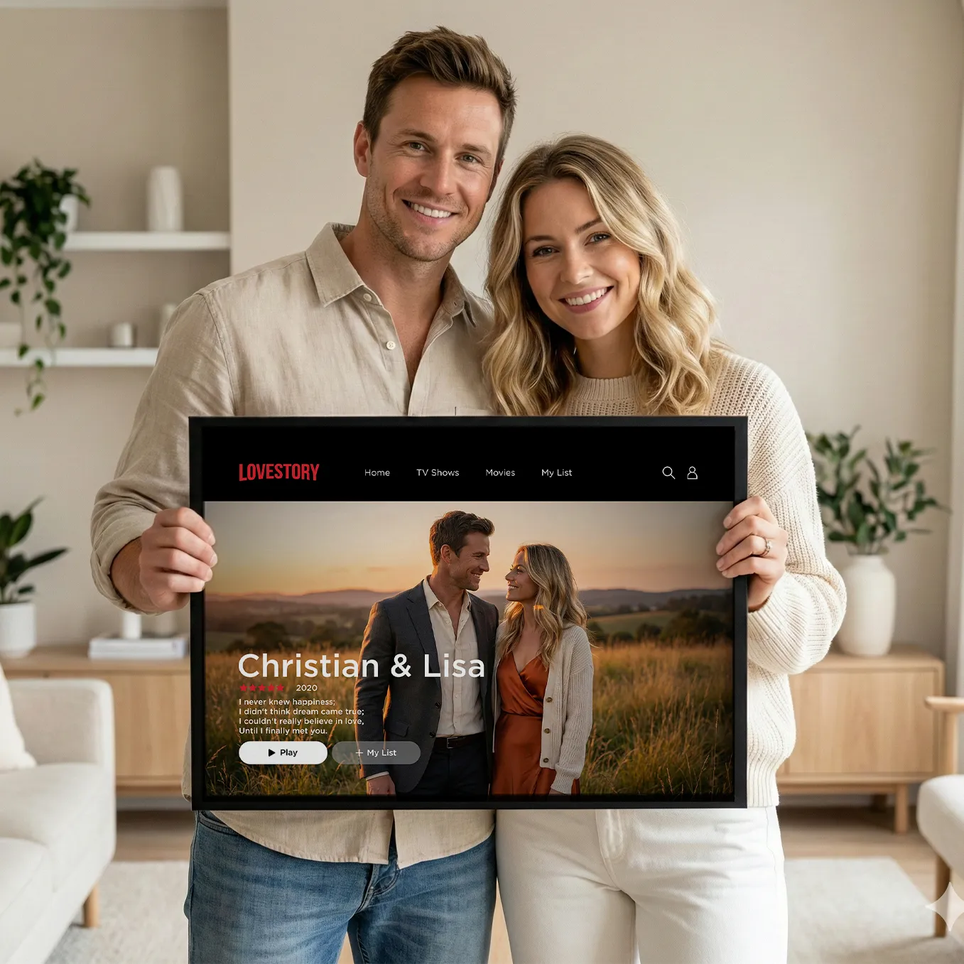Gestalte jetzt Dein personalisiertes Liebesfilmposter. Ideal als personalisiertes Geschenk zum Jahrestag, Valentinstag oder auch zur Hochzeit. Personalisiere das Poster einfach mit Euren Namen, Eurem Jahr und einem Bild von Euch.